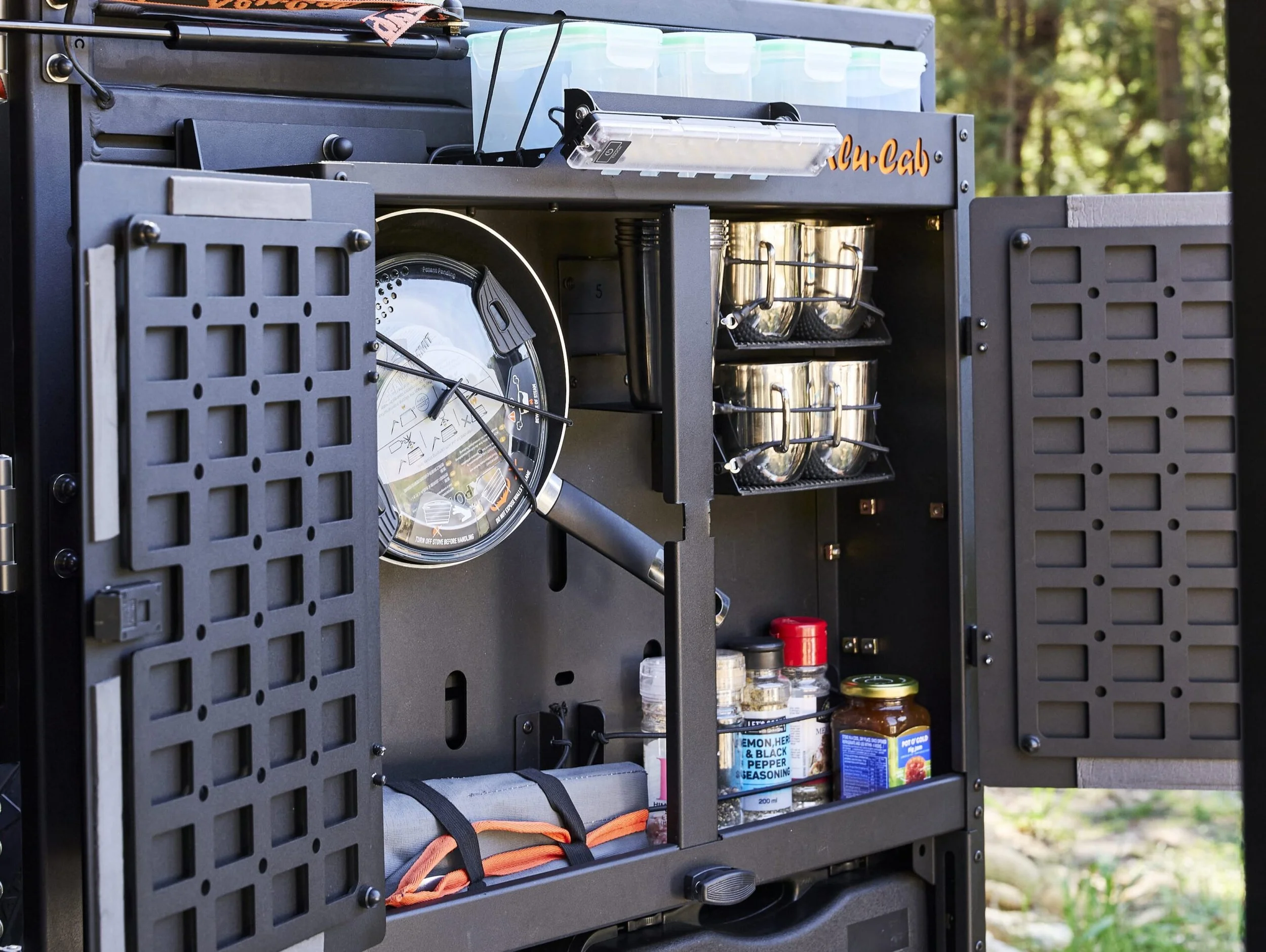 Alu-Cabs färdiga köksmodul. Fästs enkelt i spåren på bakdörren hos alla MOD-CAP modeller. Finns i två varianter, en med endast lådan och en besticksrulle, och en med extra allt fullproppad med allt du behöver.